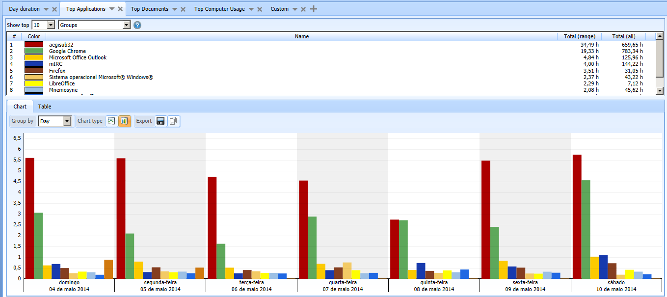 Percebam que dá para ver exatamente onde foram os intervalos dos tomates. Além disso, ele exibe outros gráficos de informações. Por exemplo, o gráfico abaixo mostra quanto tempo passei em cada programa durante uma semana.